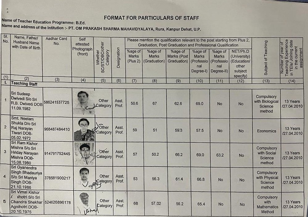 Format for Particulars of B.Ed Staff